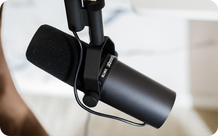 В нашей студии используется профессиональное оборудование для записи звука и видео. Студия оснащена четырьмя микрофонами Shure SM7B и аудиоинтерфейсом (звуковой картой) Audient Evo 8, обеспечивающими студийное звучание голоса с эффективным подавлением внешних шумов.